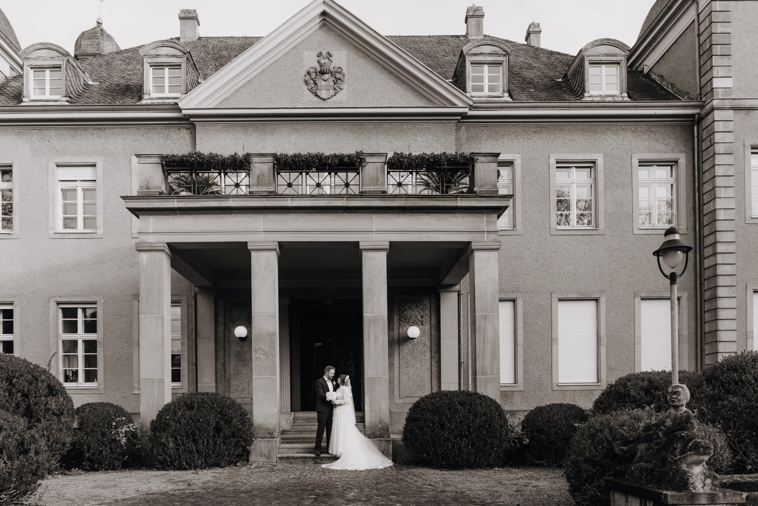 Für die Hochzeitsfotos haben die beiden das Schloss Garath in Düsseldorf als Fotolocation gewählt. Hier kann in einer märchenhaften Kulisse sowohl außen im Park, als auch im Treppenhaus und dem edlen traumhaften Ballsaal geshootet werden. Dafür bucht man sich einfach einen Slot und hat die Räumlichkeiten ganz für sich alleine.